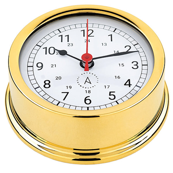 Autonautic Skibsur R95D er udviklet til dig, der værdsætter klassisk maritimt design, præcision og håndværk. Som en del af Atlantic 95-serien har dette skibsur en base på 95 mm, en elegant hvid skive og et kabinet i forgyldt messing, hvilket giver et eksklusivt og tidløst udtryk.