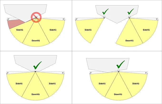 Die CHIRP ClearVü/SideVü-Elemente haben eine Nennleistung von 500 W pro Element (insgesamt 1.500 W) und arbeiten mit 260/455 kHz. Das herkömmliche CHIRP-Sonar hat eine Nennleistung von 600 W und arbeitet mit den CHIRP-Mittelfrequenzen von 80–160 kHz. Der Geber verfügt über einen integrierten, schnell reagierenden Temperatursensor. Für Rumpfneigungen von weniger als 25 Grad.