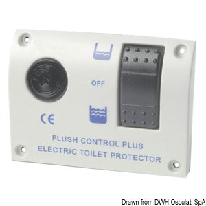 Elektrisk betjeningspanel til elektriske toiletter 12 V fra Osculati. Panelet er fuldt vandtæt og udstyret med beskyttelsessikring samt mikrorelæ med to positioner for strøm og styring.