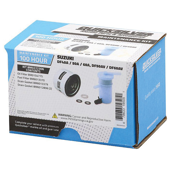 Quicksilver® 100 timers vedligeholdelsessæt 8M0222306 indeholder alle de dele, du skal bruge for at udføre en 100-timers eller årlig service på din Suzuki® påhængsmotor i én praktisk pakke.