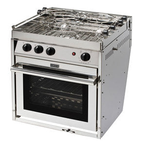 De kendte Force 10 komfurer produceres nu på ENO´s fabrik. | Lækkert 3-blus komfur i rustfrit stål med 17L ovn med grillfunktion. | Inkl. elektrisk tænding.| Smart ovnlåge, der glider ind under ovnrummet når man åbner den.| Mål:| B: 508 mm| D: 508 mm (excl. gastilkobling)| H: 483 mm| Vægt: 34 kg| Find øvrige specifikationer og mål her: | http://www.force10.com/gas_gimballed_3burner.html| OBS: Force 10-komfuret med 3 blus findes i 5 varianter. | Denne er varianten ’Euro Compact’.