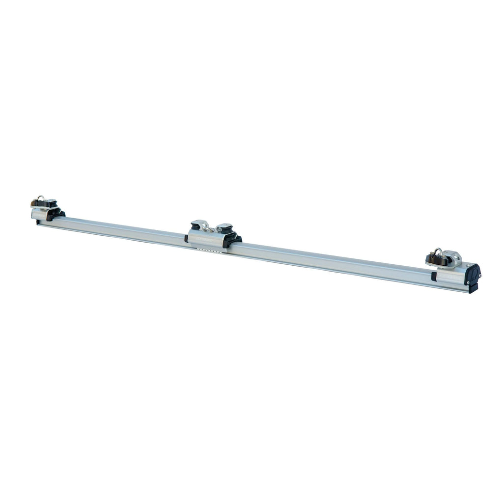 Stor skudskinne med rullelejevogn og glidebærende remskiver, et system der tåler meget og holder længe. Fremstillet på Rutgersons fabrik i Svenska Marstrand. Skinnen monteres med m6 bolte gennem dækket. Se manualen for mere detaljeret installationsvejledning.