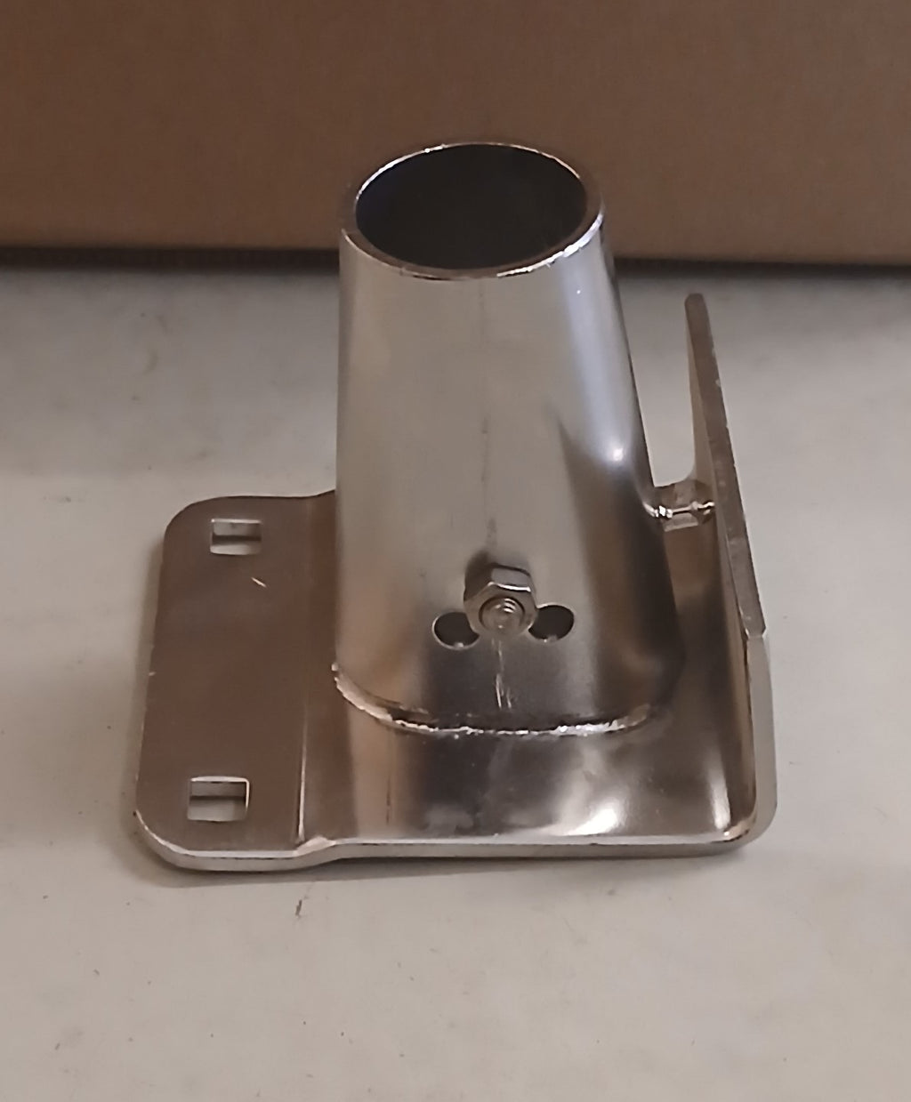 Meget stærk scepterfod i poleret rustfrit stål. Monteres med fire skruer ved hjælp af skruehullerne. Skruer medfølger ikke.