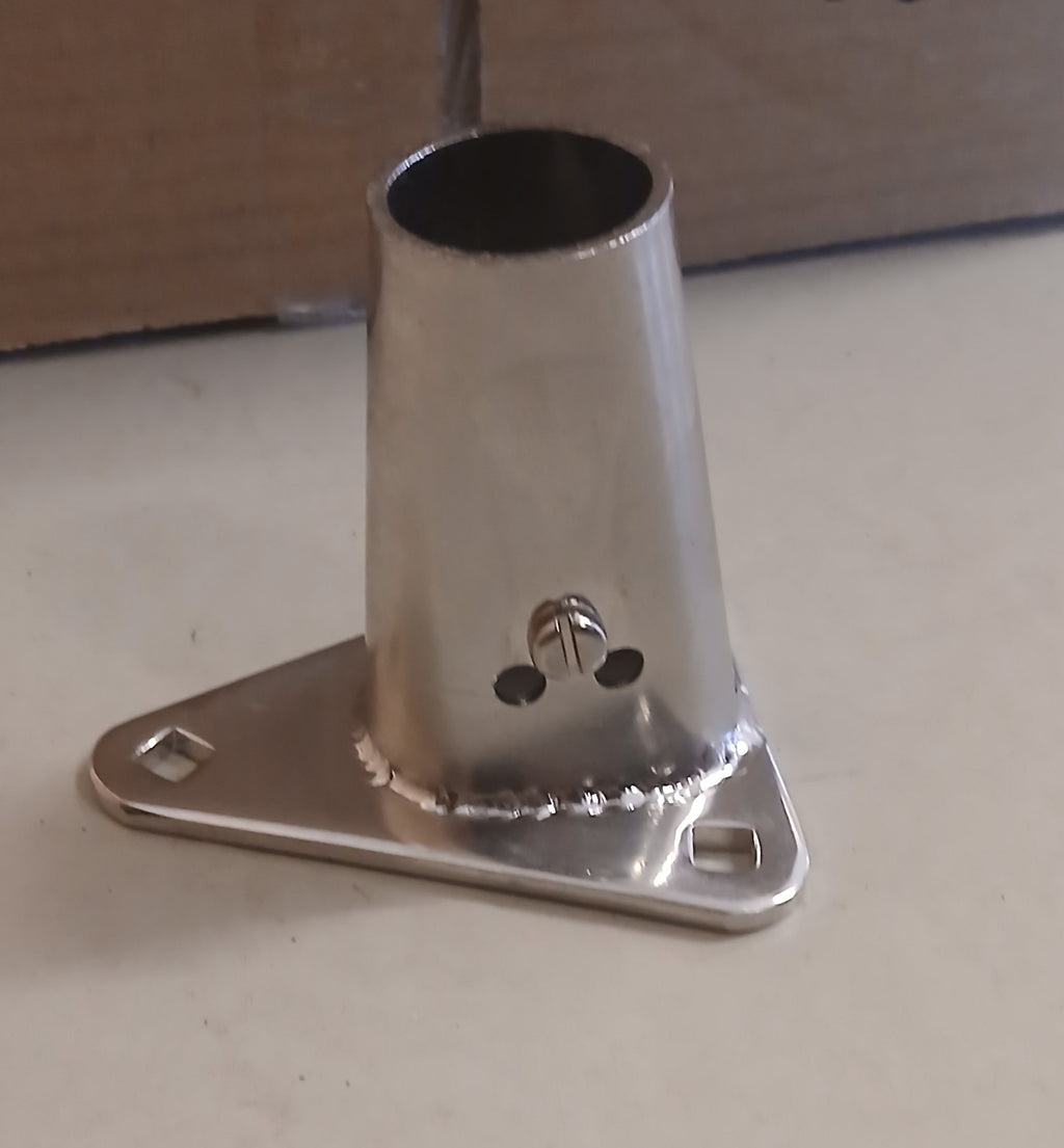 Meget stærk scepterfod i poleret rustfrit stål. Monteres med 3 skruer ved hjælp af skruehullerne. Skruer medfølger ikke.