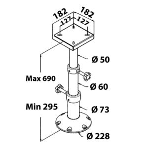 Tri-teleskopisk bordben i anodiseret aluminium fra Osculati. Manuel betjening og ingen behov for boring i gulvet ved sænkning.